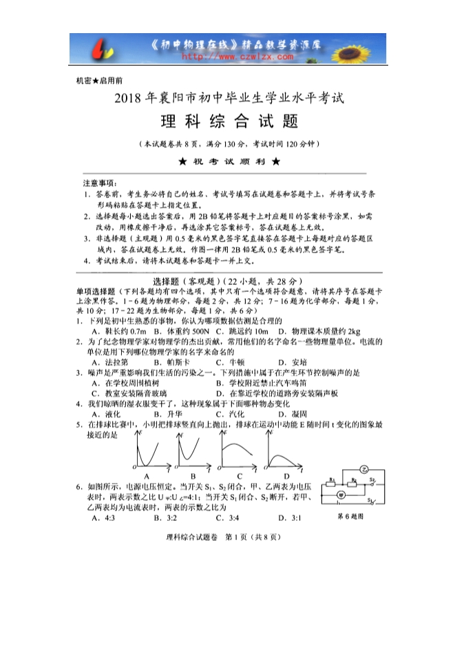 湖北省襄阳市2018年中考理综(物理部分)试题(图片版,含答案)