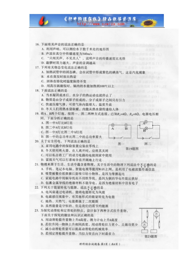 湖北省黄石市2018年中考理综(物理部分)试题(图片版,含答案)