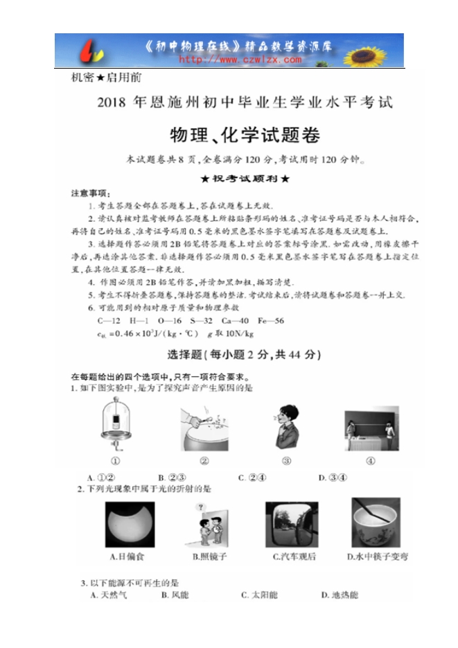 湖北省恩施州2018年中考物理试题(图片版,含答案)