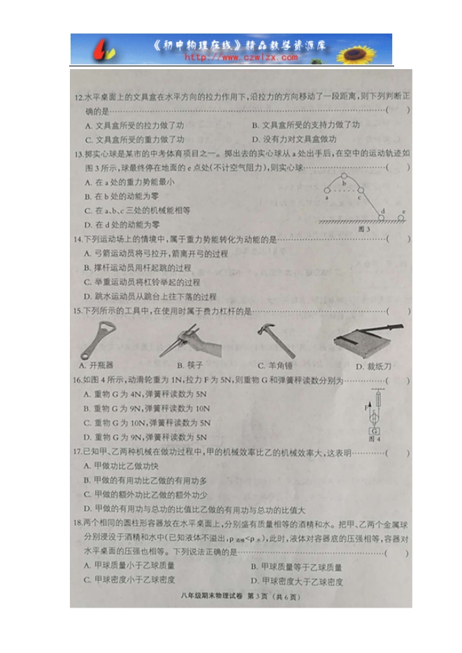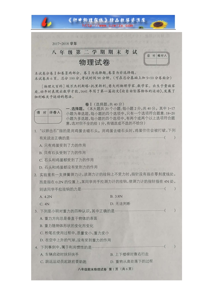 【内容简介】教科版2017-2018学年度八年级第二学期期末物理测试卷及答案(图片版)