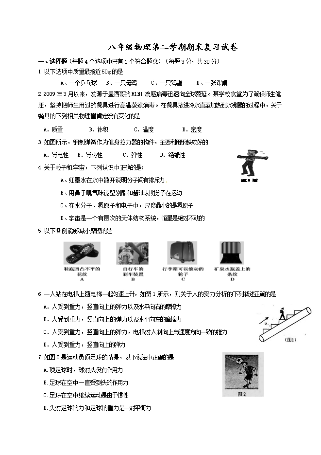 2.2009年3月以来,发源于墨西哥的H1N1流感病毒迅速向全球蔓延 。某学校食堂为了确保师生健康,坚持把师生用过的餐具进行高温蒸煮消毒。在餐具放进冷水直至加热到水沸腾的 过程中,关于餐具的下列相关物理量肯定没有变化的是