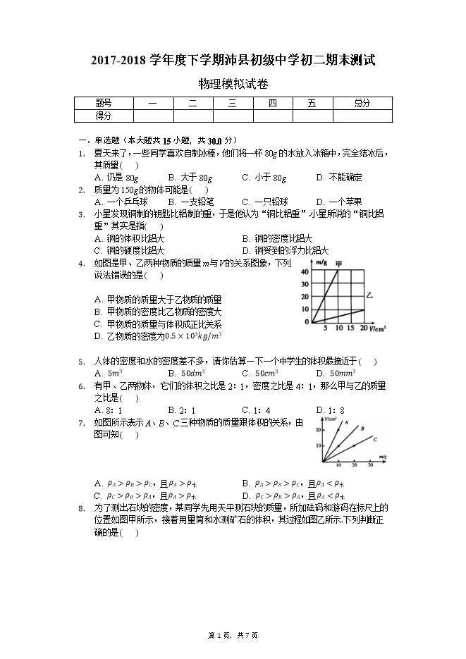 夏天来了,一些同学喜欢自制冰棒,他们将一杯80g的水放入冰箱一、单选题(本大题共15小题,共30.0分)