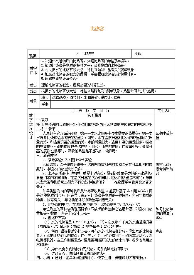 2.知道比热容是物质的特性之一,会查物质的比热容表。