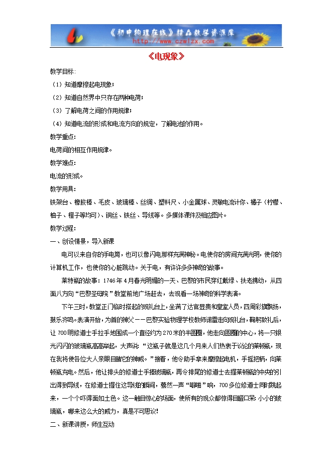 铁架台、橡胶棒、毛皮、玻璃棒、丝绸、塑料尺、小金属球、灵敏电流计你、橘子(柠檬、柚子、橙子等均可)、铜丝、铁丝、导线等。多媒体课件及相应图片。