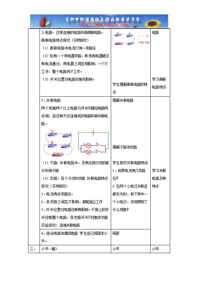 【内容简介】教学目标 1、通过学习,理解电路的连接,能理解串联和并联的连接方法
