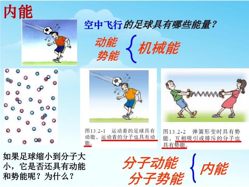 【内容简介】人教版《13.2内能》ppt课件,共有36张幻灯片,课件引导学生类比的方法认识了内能的概念并讨论了内能的大小与哪些因素有关,以及内能与温度和质量的关系,课件还展示了改变内能的二种方式等。