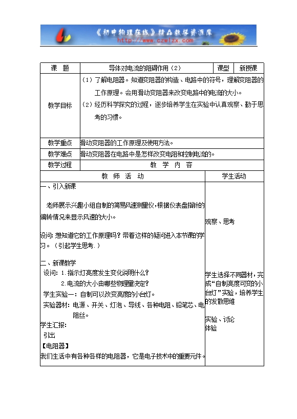 【内容简介】课 题导体对电流的阻碍作用(2)课型新授课