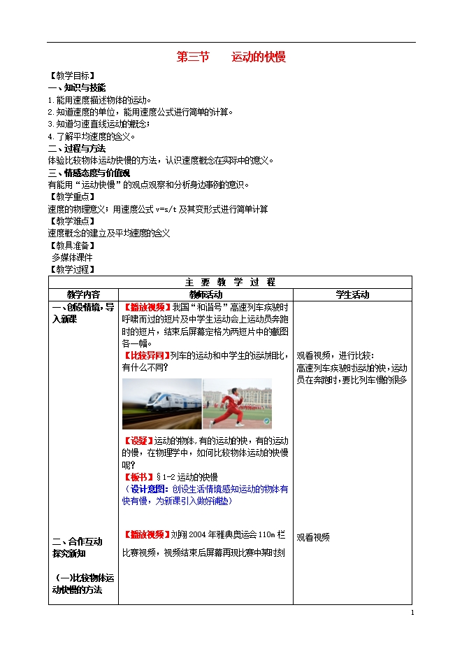 (新版)人教版八年级物理上册第1章机械运动第3节运动的快慢 教学设计