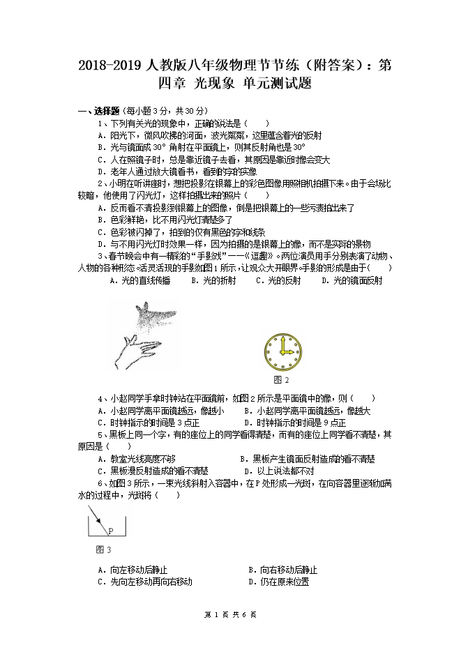 2018-2019人教版八年级物理节节练(附答案):第四章 光现象 单元测试题