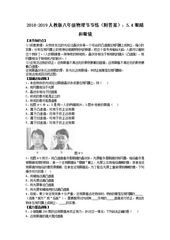 2018-2019人教版八年级物理节节练(附答案):5.4眼睛和眼镜