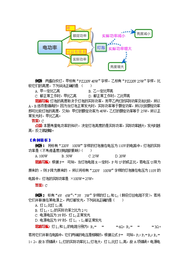 例题 两盏白炽灯,甲标有“PZ220V 40W”字样,乙标有“PZ220V 25W”字样,比较它们的亮度,下列说法正确的是 ( )