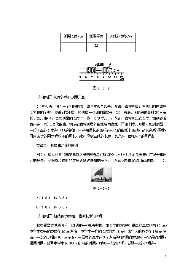 例2 中华人民共和国的国旗为长方形五星红旗,如图1-3-3所示是天安门广场升旗仪式的场景,根据图片提供的信息估测该国旗的宽度,下列数据最接近实际情况的是( )