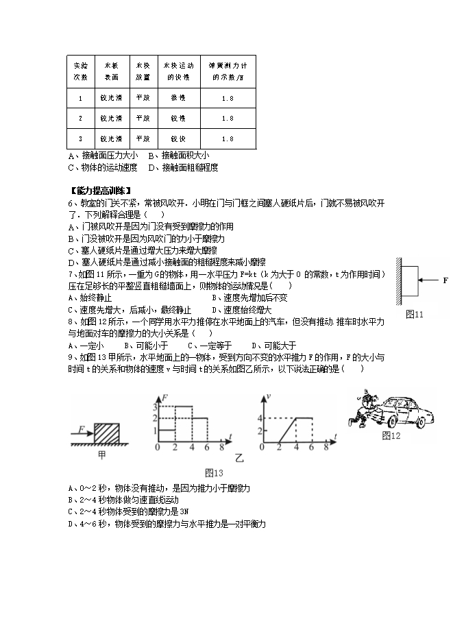5、在做“探究滑动摩擦力大小与哪些因素有关”实验时,某同学用弹簧测力计拉着同一木块在水平木板上做匀速直线运动,如图10所示,实验记录如下表.该实验是为了研究滑动摩擦力与下列哪个因素的关系( )