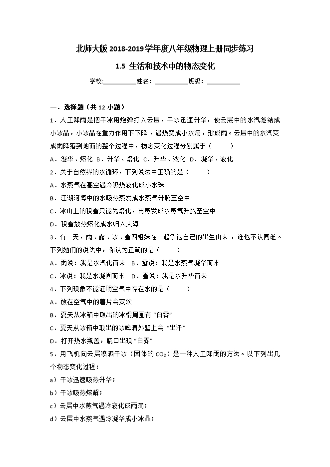 北师大版2018-2019学年度八年级物理上册同步练习:1.5 生活和技术中的物态变化(附解析)