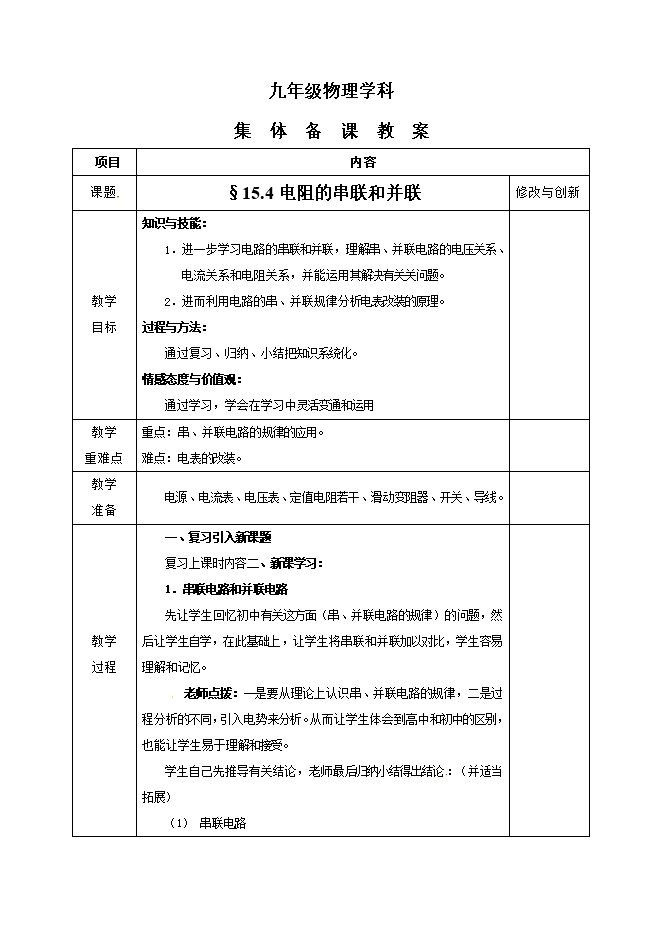 - 11142019沪科版九年级物理全册教案+课件:15.4电阻的串联和并联