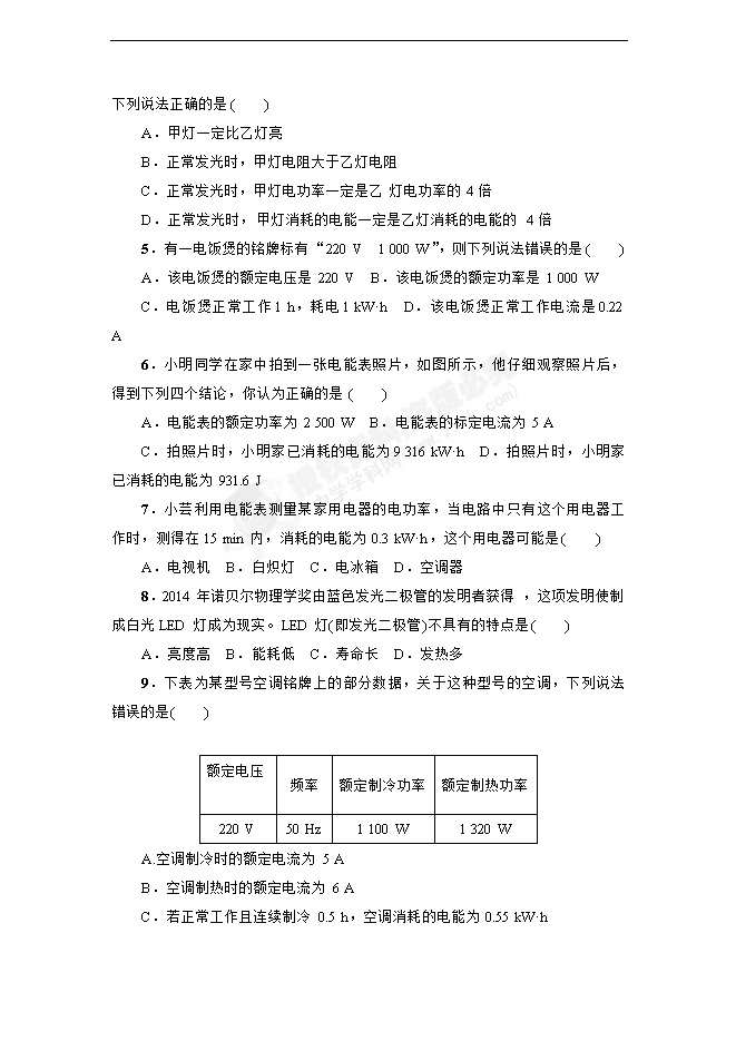 5.有一电饭煲的铭牌标有“220 V 1 000 W”,则下列说法错误的是( )