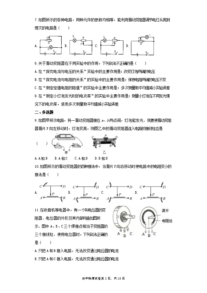 7.如图所示的各种电路,同种元件的参数均相等,能利用滑动变阻器调节电灯从亮到熄灭的电路是( )