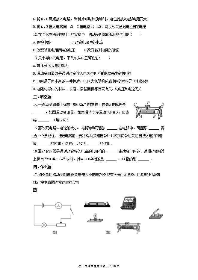 1.如图所示是连接入电路中的滑动变阻器,当滑动变阻器的滑片P向左滑动时,滑动变阻器连入电路的阻值将( )