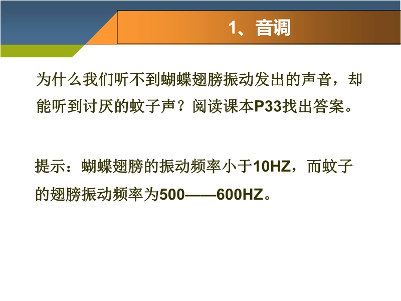 【内容简介】人教版八年物理上册:《2.2声音的特性》PPT,课件共23张幻灯片,课件主要引导学生探究了声音的三个要素:音调、响度、音色,并探究了音调与频率的关系,响度与振幅的关系等