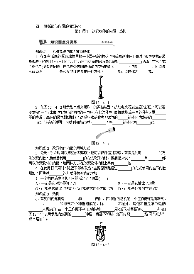 2018年秋苏科版九年级物理上册同步练习:12.4机械能与内能的相互转化 第1课时 改变物体的内能 热机