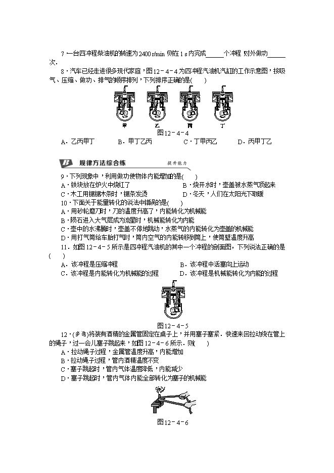 6.常见的内燃机有________和________两种.四冲程内燃机的一个工作循环是由吸气、________、________和排气四个冲程组成的.除________冲程外,其他冲程是靠飞轮的________来完成的.在一个工作循环中,曲轴转动________周,燃气对活塞做功________次.如图12-4-3所示是内燃机的________冲程,活塞下降时,燃气内能________(选填“减少”或“增加”).