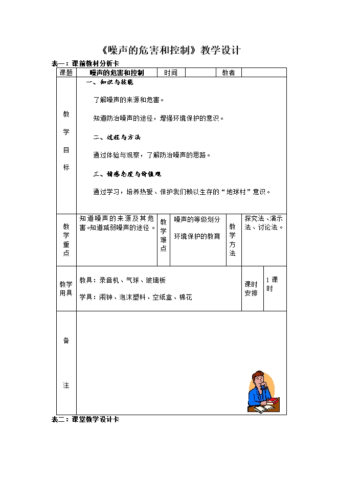 这节课从声音的分类角度得出乐音与噪声中噪声的有关知识。主要分析了噪声的来源、噪声的等级和危害及控制噪声的方法等内容。对噪声和来源我们是通过录像与实际生活相联系的方法得出的;对噪声的等级和危害我们是通过看书和录像相结合的方法得出的;对噪声控制的方法我们是通过一个个的实例总结出的。
