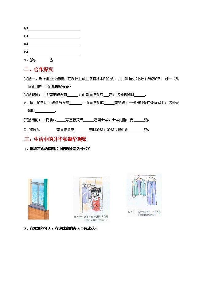 【内容简介】【目标导学】:1.知道升华和凝华的概念,知道升华要吸热,凝华要放热 2.对生活中的升华和凝华现象,能用物理的语言进行解释【重点导引】:1.认识升华和凝华现象2.解释生活中的一些升华和凝华现象【课前导问】:思1:自然界中,固态与气态之间能否直接转化呢?想一想,请举例说明。