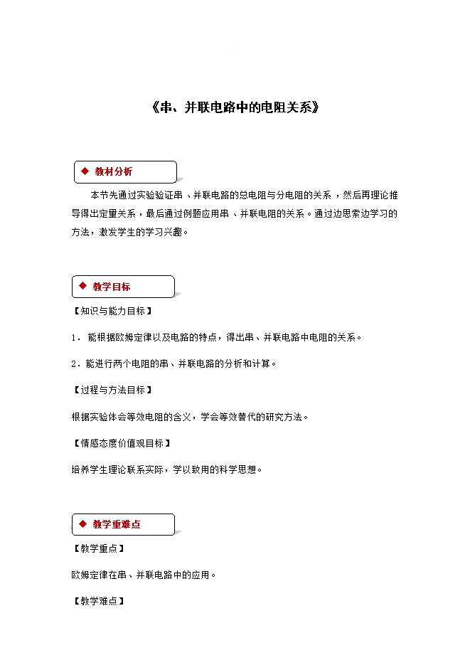 【内容简介】本节先通过实验验证串、并联电路的总电阻与分电阻的关系,然后再理论推导得出定量关系,最后通过例题应用串、并联电阻的关系。通过边思索边学习的方法,激发学生的学习兴趣。