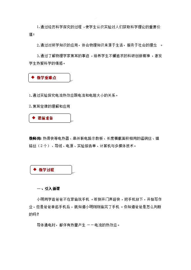 2018-2019北师大版九年级全册物理教案:《13.4电流的热效应》(详案附教材分析)