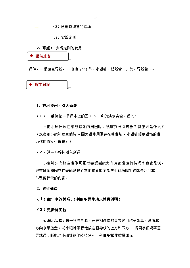 2018-2019北师大版九年级全册物理教案:《14.3电流的磁场》(详案附教材分析)