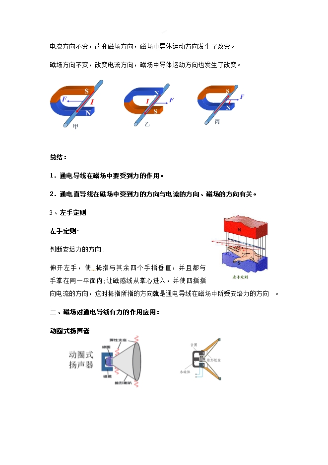 【内容简介】本节内容是在前面的所学的磁的基本知识与电的基本知识的基础上进行实验探究,是对磁场对放入其中的磁体有力的作用的运用与理解,是对后面电动机的学习提供基础知识。本节内容是一节过度的环境,是将电与磁结合在一起的章节,起到承上启下的作用。