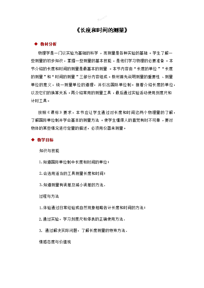 【内容简介】物理学是一门以实验为基础的科学,而测量是各种实验的基础。学生了解一些测量的初步知识,掌握一些测量的基本技能,是他们学习物理的必要准备。本节介绍的长度和时间的测量是最基本的测量。本节内容由“长度的单位”“长度的测量”和“时间的测量”三部分内容组成。教材首先说明测量的重要性、测量单位的意义,统一测量单位的道理,并引出国际单位制。接着介绍长度的单位,以及它们的换算关系。再介绍常用的测量工具,最后通过实验活动使用刻度尺和计时工具。