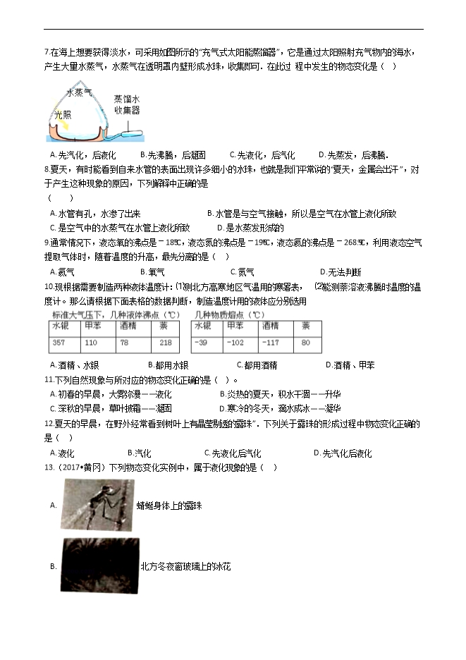 2018-2019教科版八年级上册物理练习题:5.3汽化和液化(附答案)
