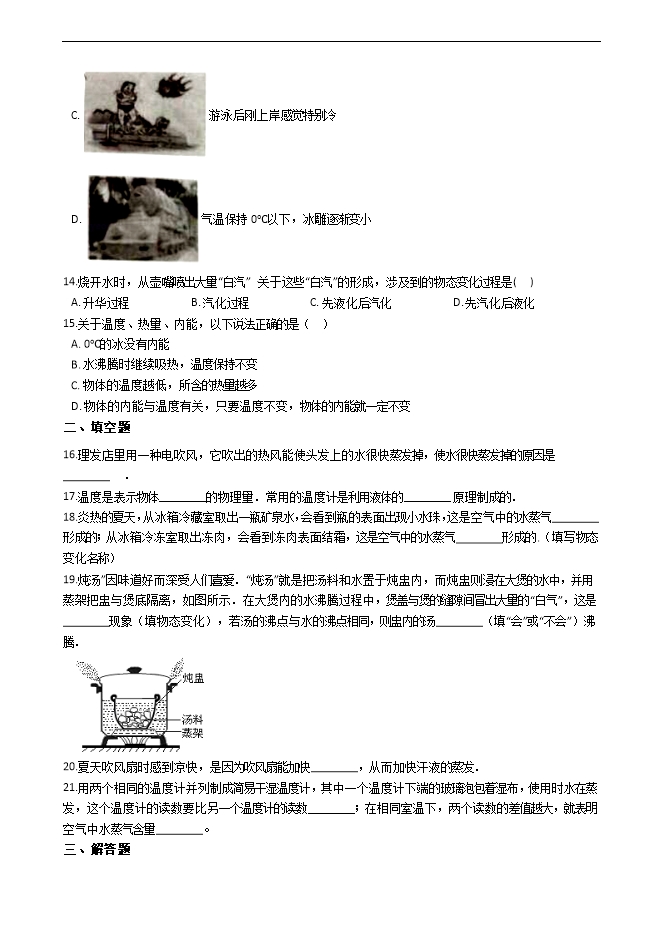 【内容简介】炖汤”因味道好而深受人们喜爱.“炖汤”就是把汤料和水置于炖盅内,而炖盅则浸在大煲的水中,并用蒸架把盅与煲底隔离,如图所示.在大煲内的水沸腾过程中,煲盖与煲的缝隙间冒出大量的“白气”,这是________现象(填物态变化),若汤的沸点与水的沸点相同,则盅内的汤________(填“会”或“不会”)沸腾.