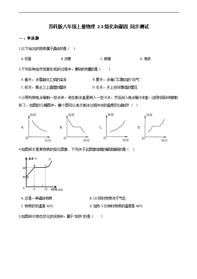 苏科版八年级上册物理:2.3熔化和凝固 同步测试
