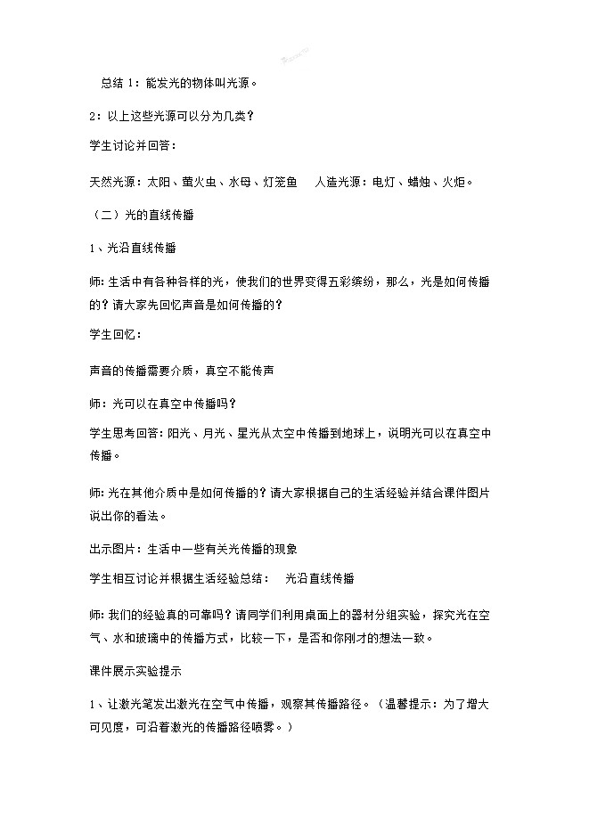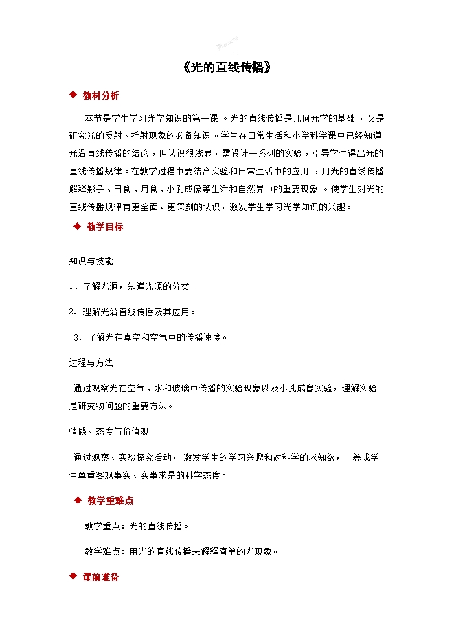 【内容简介】本节是学生学习光学知识的第一课。光的直线传播是几何光学的基础,又是研究光的反射、折射现象的必备知识。学生在日常生活和小学科学课中已经知道光沿直线传播的结论,但认识很浅显,需设计一系列的实验,引导学生得出光的直线传播规律。在教学过程中要结合实验和日常生活中的应用,用光的直线传播解释影子、日食、月食、小孔成像等生活和自然界中的重要现象。使学生对光的直线传播规律有更全面、更深刻的认识,激发学生学习光学知识的兴趣。