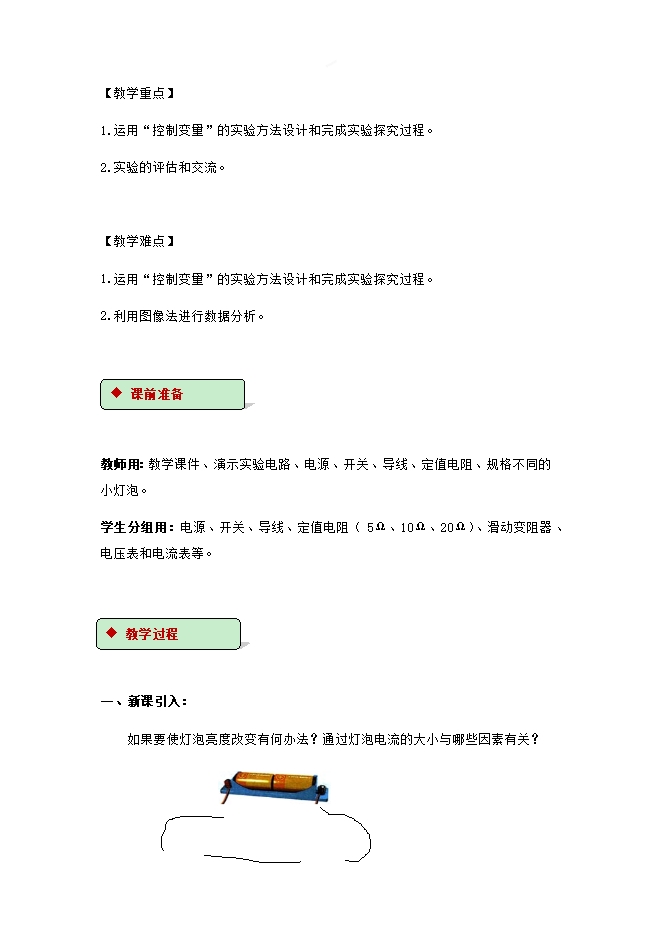 【内容简介】本节的内容主要是通过学生探究实验展现,让学生经历了“问题—思考—探究实验—结论”的过程,很好地体现了新课标让学生在体验知识的形成、发展过程中主动获取知识的精神,培养了学生的动手能力和观察能力。电流与电压和电阻的关系实际上就是欧姆定律,它是电学中的基本定律,是进一步学习电学知识和分析电路的基础,是本章的重点。