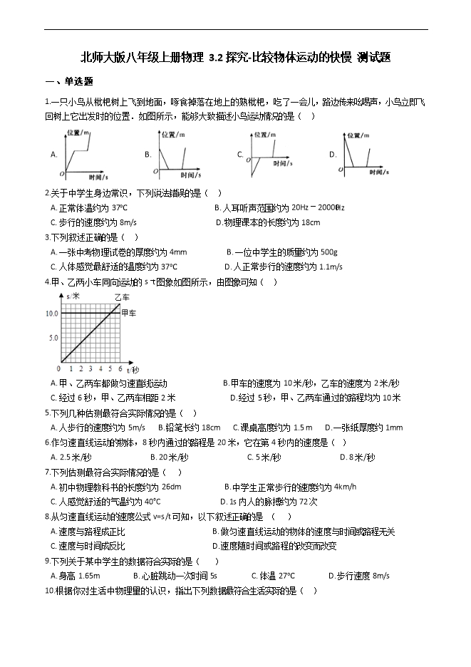 北师大版八年级上册物理《3.2探究-比较物体运动的快慢》测试题(附答案)