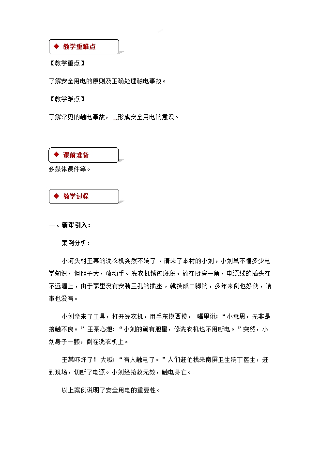 的教育内涵的具体表现,面对电气化普及的社会,安全用电知识的学习在以后的生产、生活实践中显得十分重要。通过学习本节教材的知识,学生能了解日常安全用电常识,规范日常用电行为,提高了学生利用知识解决实际问题的能力。因此这一节课无论在知识学习上还是培养学生的能力上都有着十分重要的作用。