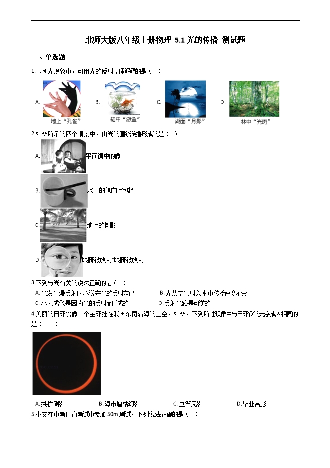 北师大版八年级上册物理《5.1光的传播》测试题(附答案)