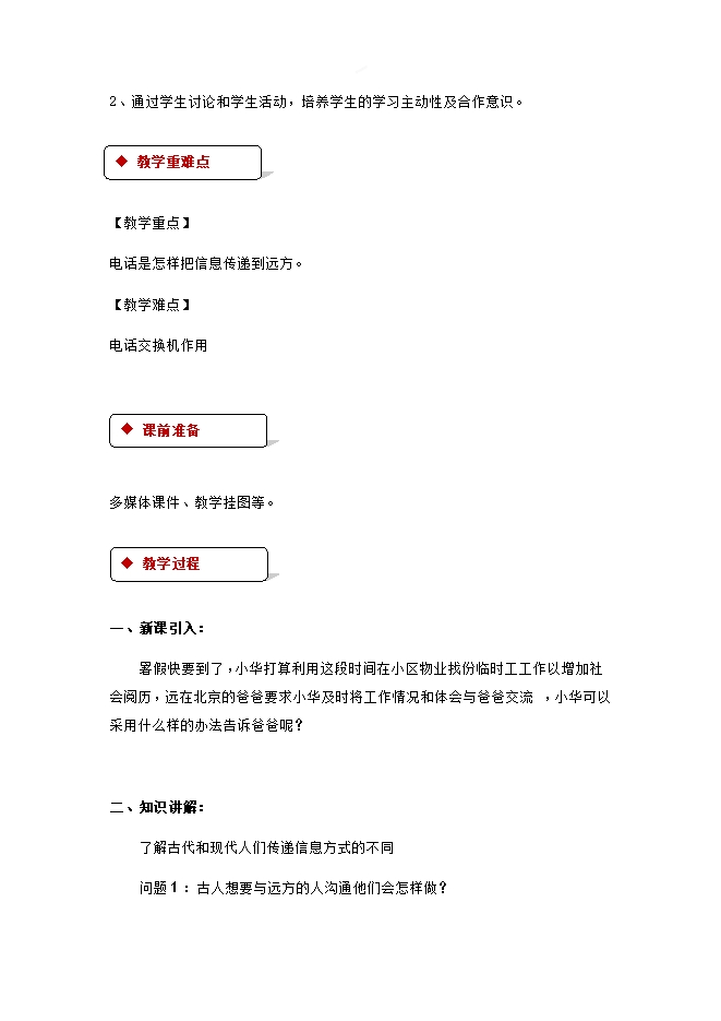 【内容简介】电话是现代家庭常见的通信工具,学生对其通信原理有着一定的了解。本节通过组合图的方式对通信发展进行回顾,使学生们对现代通信的快捷和便利有一个感性的认识。鉴于学生对于电话的内部结构、连接电话的网络不了解,教师可采用实物剖解、学生连图、多媒体、电话示教板演示等手段,教授相关知识。本节教学可以让学生参与游戏活动,了解数字通信和模拟通信的基本知识。