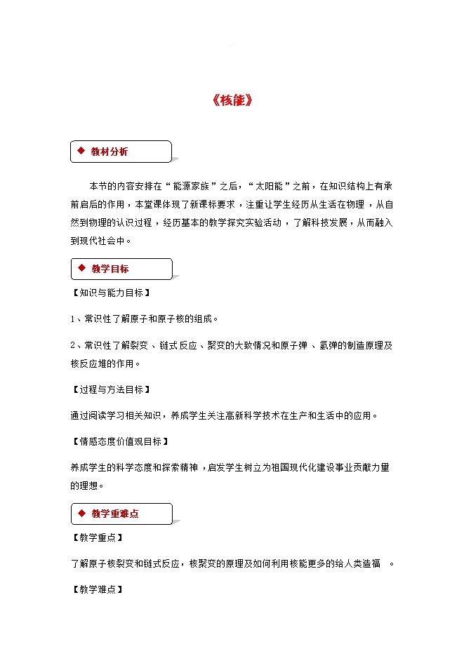 人教版九年级全册物理精品教案:22.2《核能》(附教材分析)
