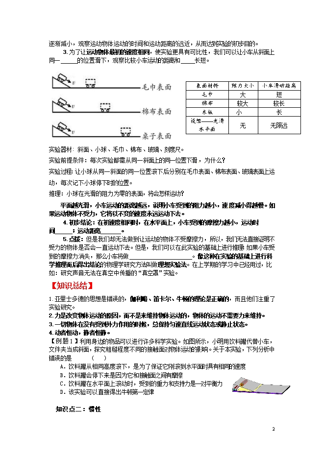 沪科版八年级物理学案与同步练习:7.1科学探究:牛顿第一定律