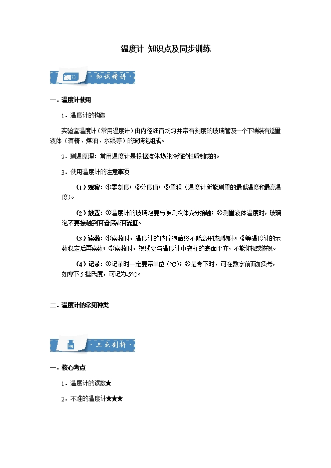 【内容简介】使用温度计的注意事项(1)观察:①零刻度;②分度值;③量程(温度计所能测量的最低温度和最高温度)。(2)放置:①温度计的玻璃泡要与被测物体充分接触;②测量液体温度时,玻璃泡不要接触到容器底或容器壁。(3)读数:①读数时,温度计的玻璃泡始终不能离开被测物体;②等温度计的示数稳定后再读数;③读数时,视线要与温度计中液柱的表面平齐,不能仰视或俯视。(4)记录:①记录时一定要带单位(°C);②是零下时,可在数字前面加负号,如零下5摄氏度,可记为-5°C。