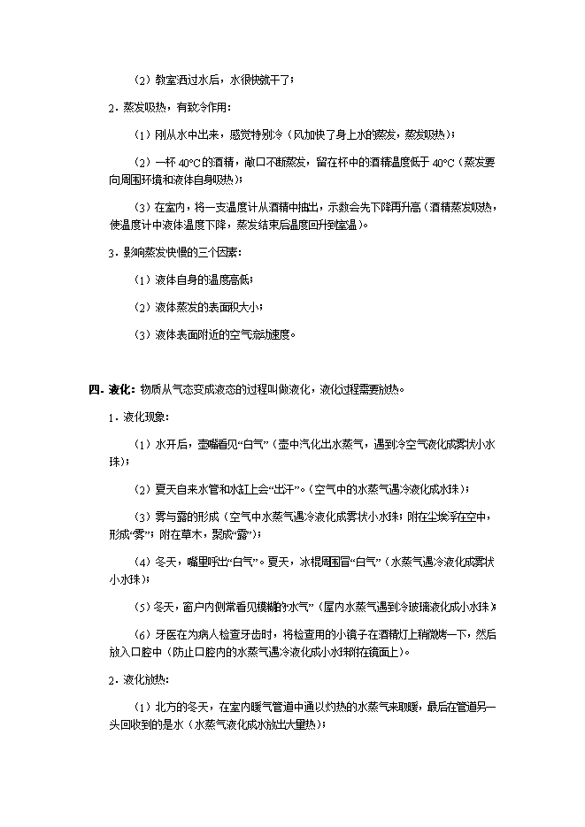 2.蒸发:任何温度下,只在液体表面发生的平和的汽化现象,蒸发时液体温度下降。