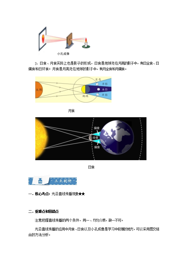 【内容简介】1.光的传播规律:光在同一均匀透明介质中沿直线传播。注:如果介质布不均匀,即使是同一种介质光也不会沿直线传播,要发生折射。例如太阳光在地球周围大气层中传播路线是弯曲的。如果介质分布均匀,光从一种介质射到另一种介质中时,一般也会改变传播方向,不再沿原方向直线传播,即光的折射现象。