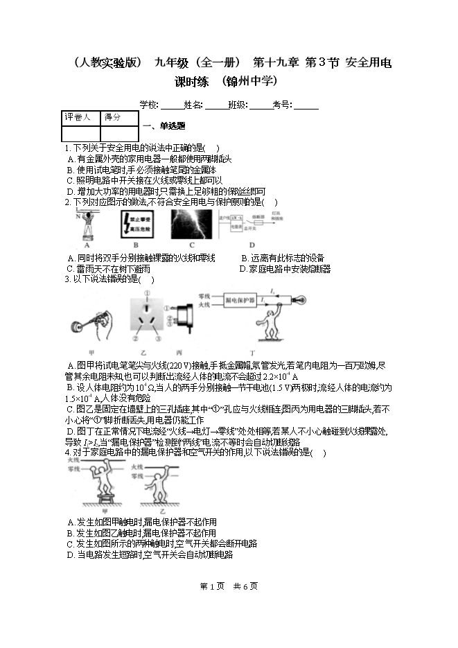 (人教实验版)锦州中学九年级物理课时练:19.3安全用电(附解析)