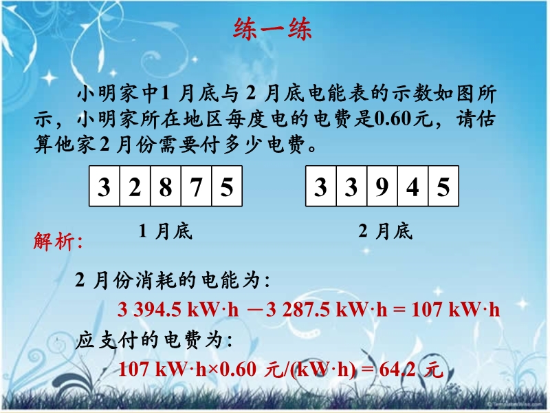 【内容简介】苏科版九年级物理《15.1电能表与电功》PPT课件共有23张幻灯片,由电费的多少引入课题,介绍各种电能表的作用和相关参数,了解一度电的作用,通过大量实例学习电能的转换,得出电功的概念,然后实验探究得出影响电功大小的因素,并进行相关练习。