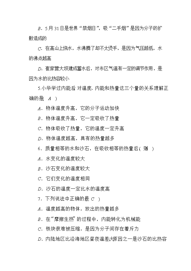 - 563教科版九年级上册物理《第一章 分子动理论与内能》单元测试题(无答案)