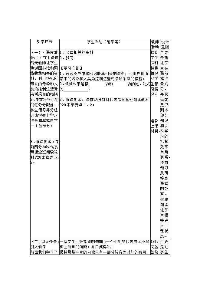 【内容简介】我说课的内容是人教版初中物理九年级全册第十四章第二节《热机的效率》。本节内容是在学生学习完热机、内燃机后,在已经学习过机械效率的基础之上对于效率进一步的学习,也为以后理解热力学第二定律积累感性知识,使学生体验到科学、技术和社会的相互关系,体验科学在社会生活和生产中的应用。
